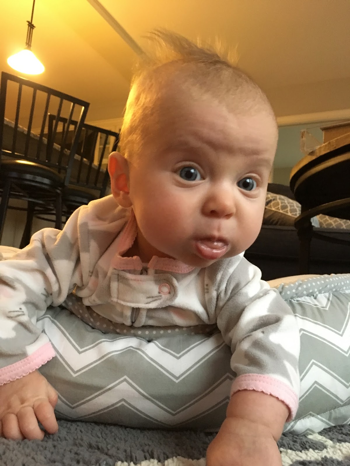 It's interesting how you don't (or can't) focus as much on what your baby can or cannot do the third time around. I have tried to keep track of the big milestones. Here are some things that come to mind: Quinn can roll over really well from back to front, but not super well from front to back. She usually gets stuck on her stomach and starts crying until someone rolls her back over. This seems unusual to me, so we're trying to work on it. She popped through her first two teeth at 3.5 months old! That caught us by surprise since the other two kids didn't get theirs until closer to 6 months. She is super smiley and laughs a lot, especially at Brooks! She "talks" a lot, especially when she first wakes up or when she is trying to put herself to sleep. She likes to sit in the bumbo when we are eating, and she seems to enjoy her jumperoo as well. She is loving baths these days. She laughs and splashes the whole time she is in there! Quinnie is so sweet and seems pretty flexible. She goes with me wherever I need to go, and even if she's tired or hungry, can keep it together as long as she is being held.